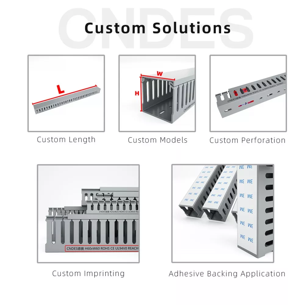 Presso CNDES forniamo una personalizzazione completa per le canaline di cablaggio. I nostri servizi spaziano da caratteristiche funzionali specializzate (antistatico, resistente ai raggi UV, facile da rompere) e regolazioni dimensionali complete (lunghezza, altezza, larghezza, posizione/profilo/passo del foro) alle opzioni estetiche di branding (colori personalizzati, logo, stampa di testi). Offriamo anche supporto adesivo.