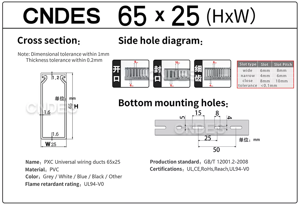 I condotti per canaline per cavi personalizzati 65×25 di CNDES sono un canale di gestione dei cavi a profilo sottile realizzato in PVC rigido. Viene utilizzato principalmente per guidare e proteggere i cavi nelle aree in cui: